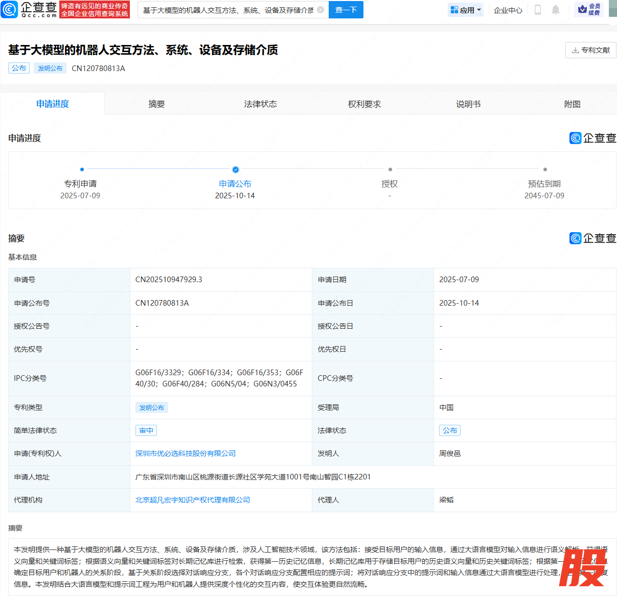 近日,优必选(09880.HK)申请公布基于大模型的机器人交互方法、系统、设备及存储介质专利。专利摘要显示,本发明提供一种基于大模型的机器人交互方法、系统、设备及存储介质,涉及人工智能技术领域,该方法包括:接受目标用户的输入信息,通过大语言模型对输入信息进行语义解析,获得语义向量和关键词标签;根据语义向量和关键词标签对长期记忆库进行检索,获得第一历史记忆信息,长期记忆库用于存储目标用户的历史语义向量和历史关键词标签;根据第一历史记忆信息确定目标用户和机器人的关系阶段,基于关系阶段选择对话响应分支,各个对话响应分支配置相应的提示词;将对话响应分支中的提示词和输入信息通过大语言模型进行处理,生成第一回复信息。本发明结合大语言模型和提示词工程为用户和机器人提供深度个性化的交互内容,使交互体验更自然流畅。