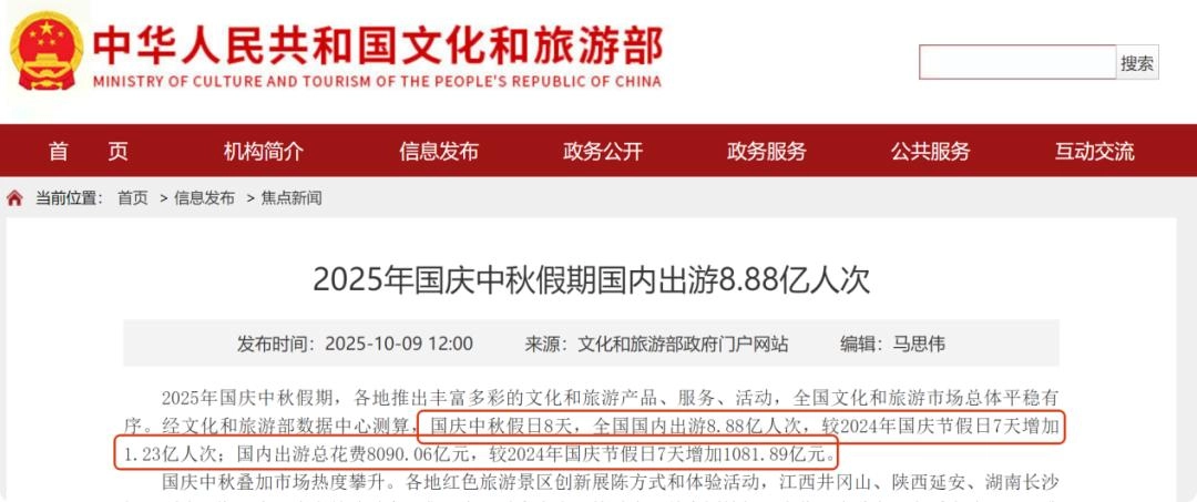10月9日,在今年8天十一国庆和中秋长假之后第一个工作日,交通部发布假期出行数据,10月1-8日,全国累计跨区域人员流动量预计24.32亿人次,日均3.04亿,同比增长6.2%。文化和旅游部披露假期出游人数达8.88亿人次,比2024年7天国庆节长假出游人数多出1.23亿人次,今年长假国内出游总花费8090.06亿元,比2024年国庆假期增长1082亿元。