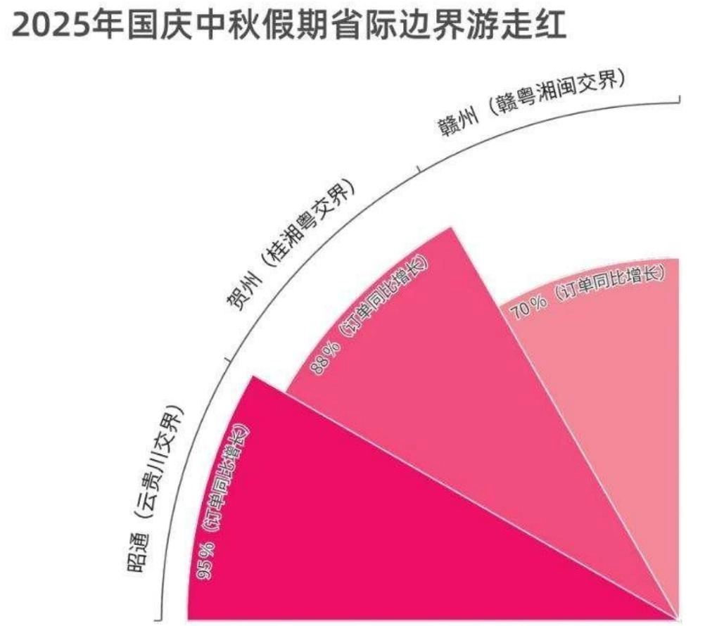 省际边界游爆发,游客可“一次性体验多省风情”一日跨三省甚至更多省的感觉极具诱惑力,云贵川交界的昭通、桂湘粤交界的贺州、赣粤湘闽交界的赣州等省际交界城市订单量同比增幅达58%-95%。
