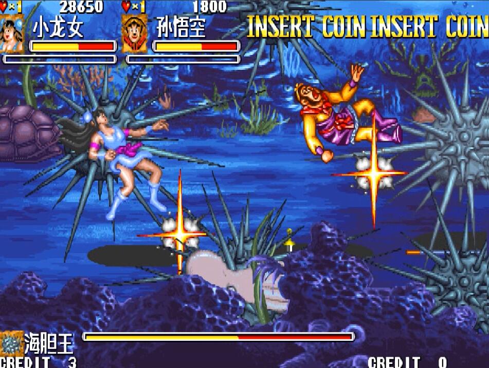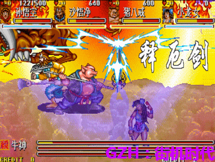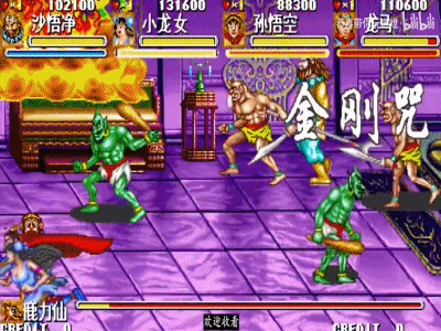 《西游释厄传》大部分法宝在释放的时候都是有无敌光环的,虽然所有人都被禁止行动,但全都是处于无敌的状态。这个操作应该借鉴了《龙与地下城》全智股配,不过这在街机史上也并不多见。