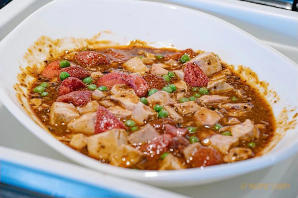 这道改良版的麻婆豆腐,要先把豆腐煎过再烧,出锅前浇上草莓酱,用酸甜平衡辣度。草莓酱的酸甜口感中和了麻婆豆腐的辛辣,形成了独特的风味,引发食客疯狂拍照打卡,可小编只想说一句“勇气可嘉”。