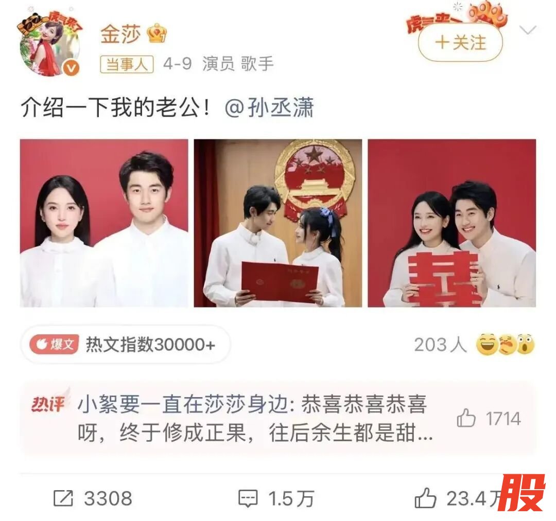 评论区画风突变。几年前那些“金莎恋爱脑”“男方图谋不轨”的声音,被一片“恭喜”淹没。