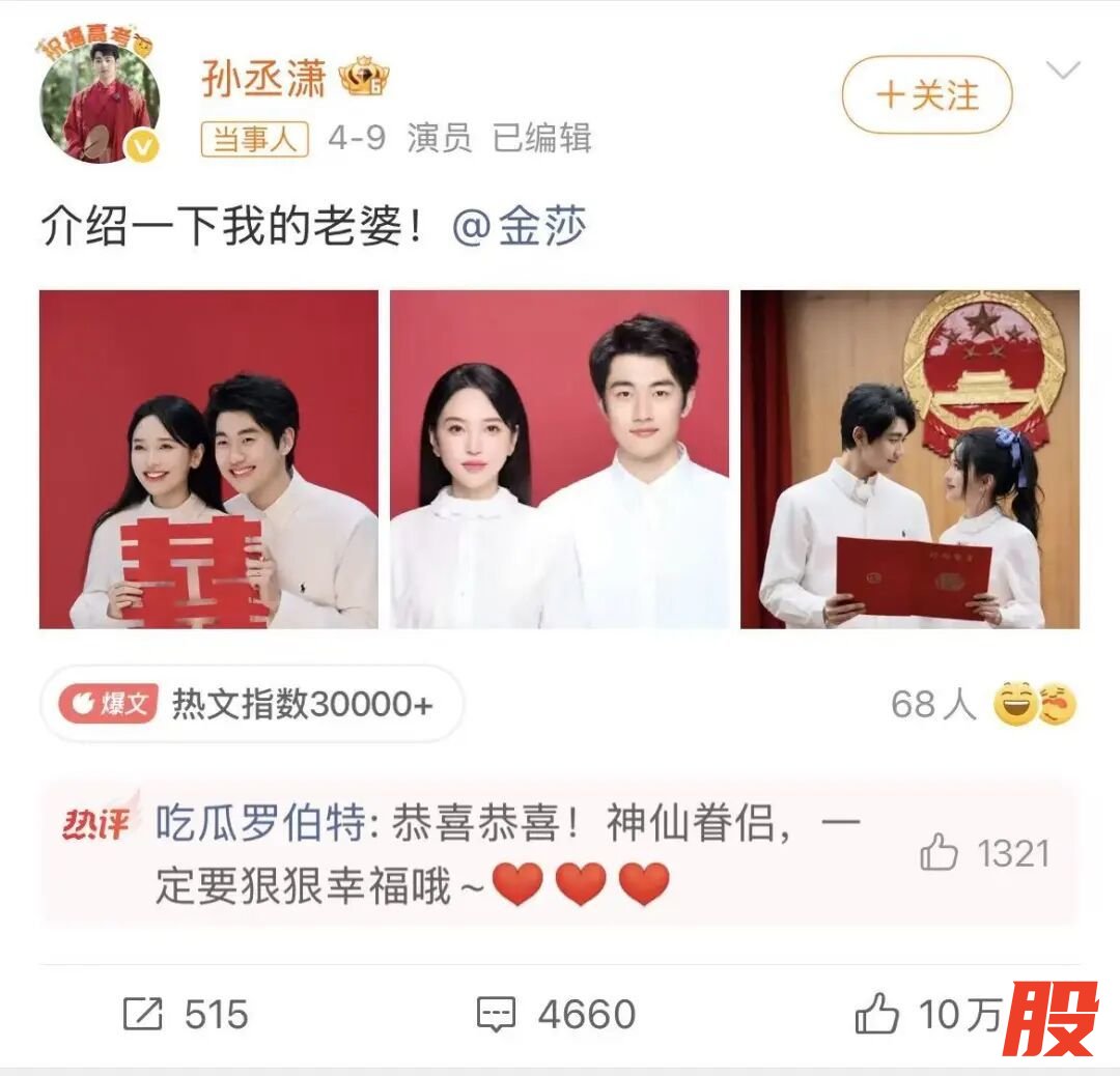 4月9日,金莎和孙丞潇同时晒出了结婚证。